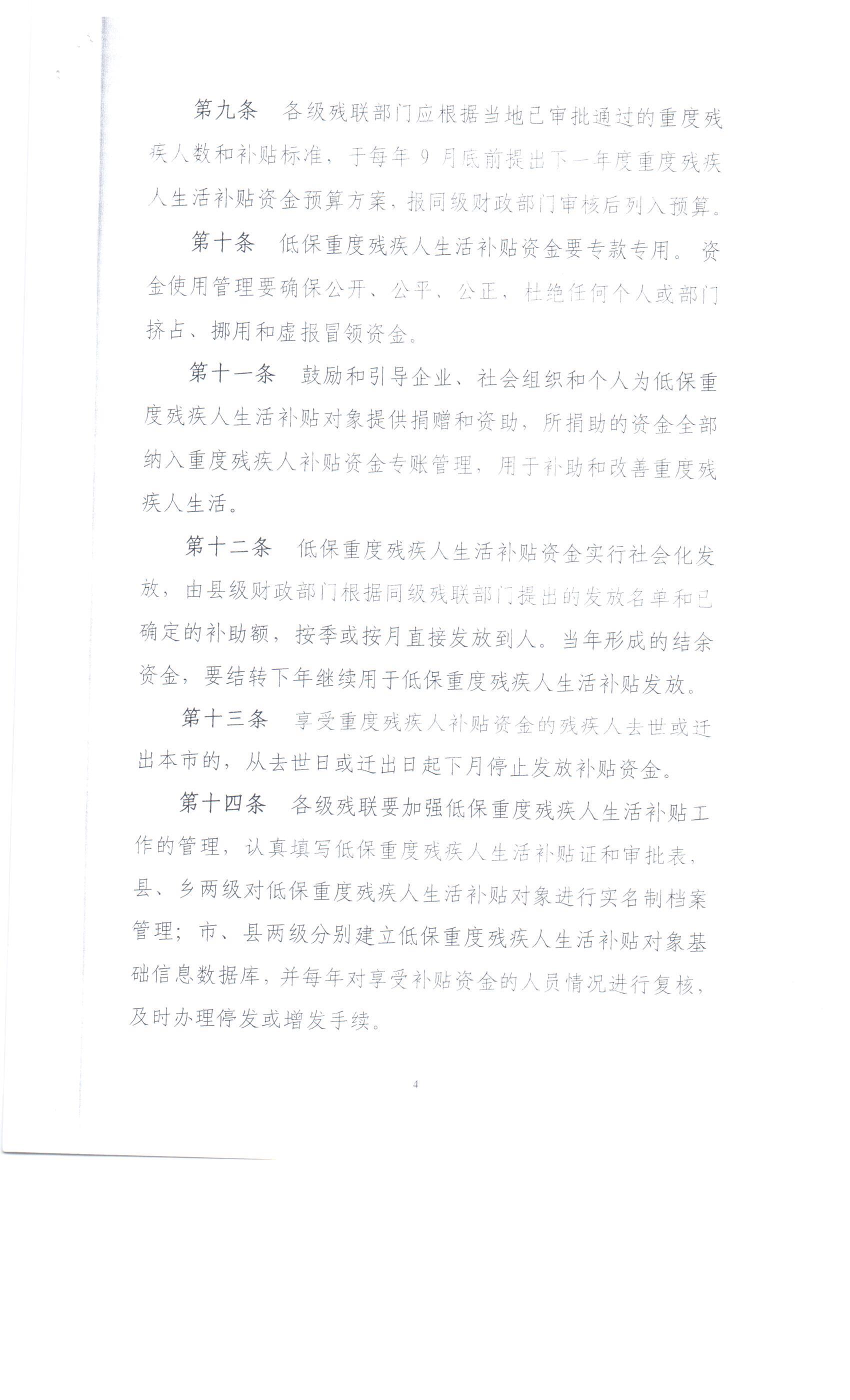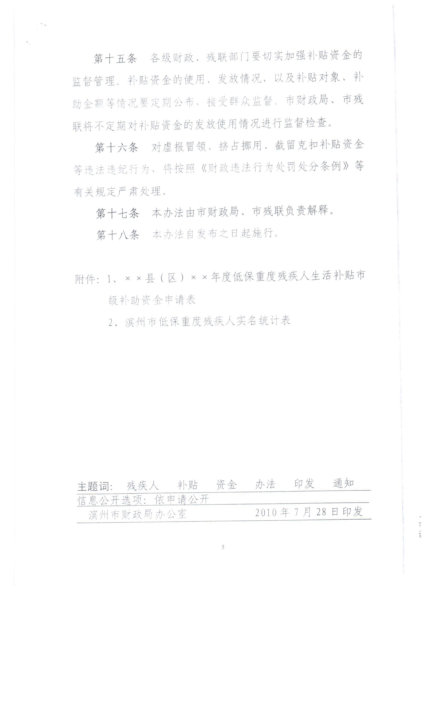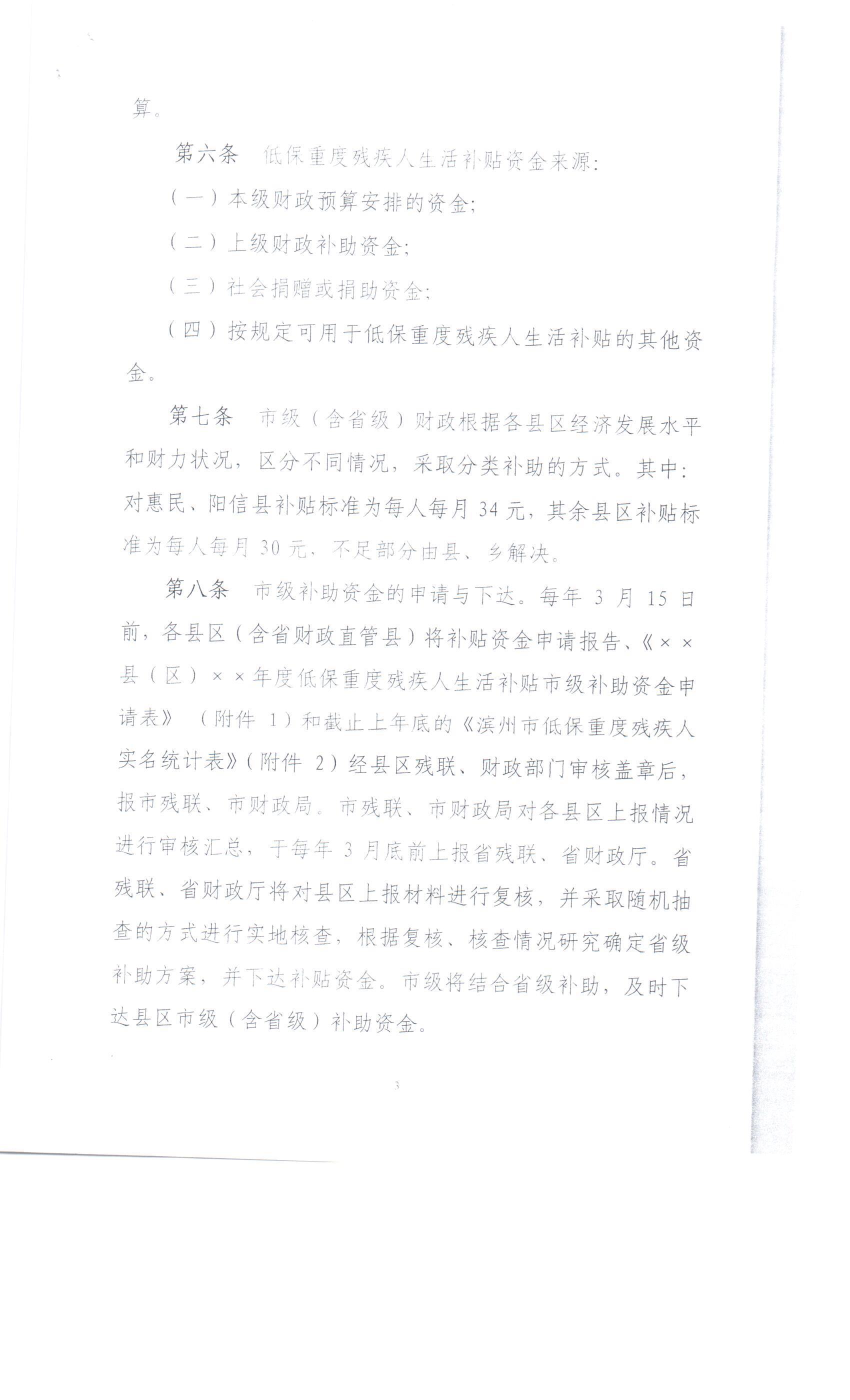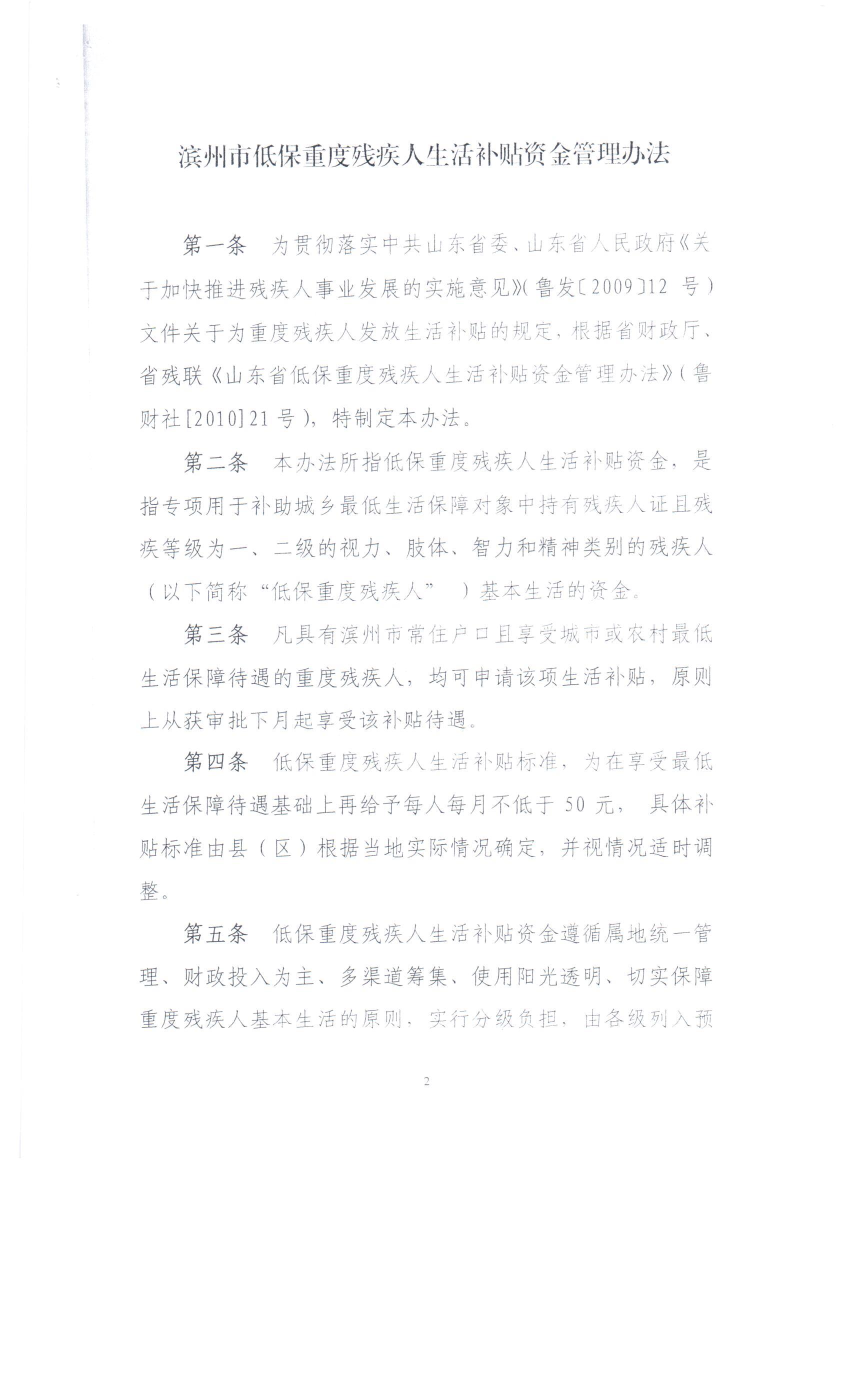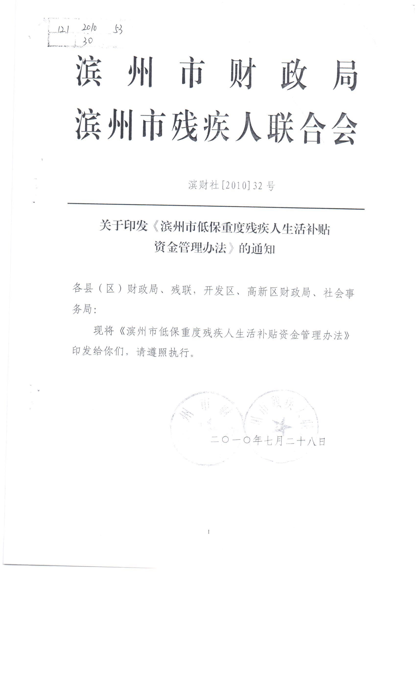 关于印发《滨州市低保重度残疾人生活补贴资金管理办法》的通知(滨财社[2010]32号)